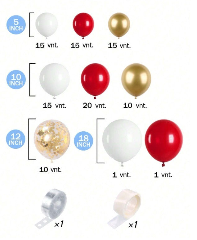Šis balionų rinkinys susideda iš 102 įvairiaspalvių ir įvairių dydžių balionų, kurie puikiai tiks bet kokiai šventei – gimtadieniui, vestuvėms, jubiliejui, ar bet kokiai kitai ypatingai progai. Rinkinį sudaro tiek įprasti, tiek išskirtiniai balionai, kurie suteiks jūsų šventei švytėjimo ir džiaugsmo, taip pat akseasurai balionų kabinimui. Rinkinyje rasite: