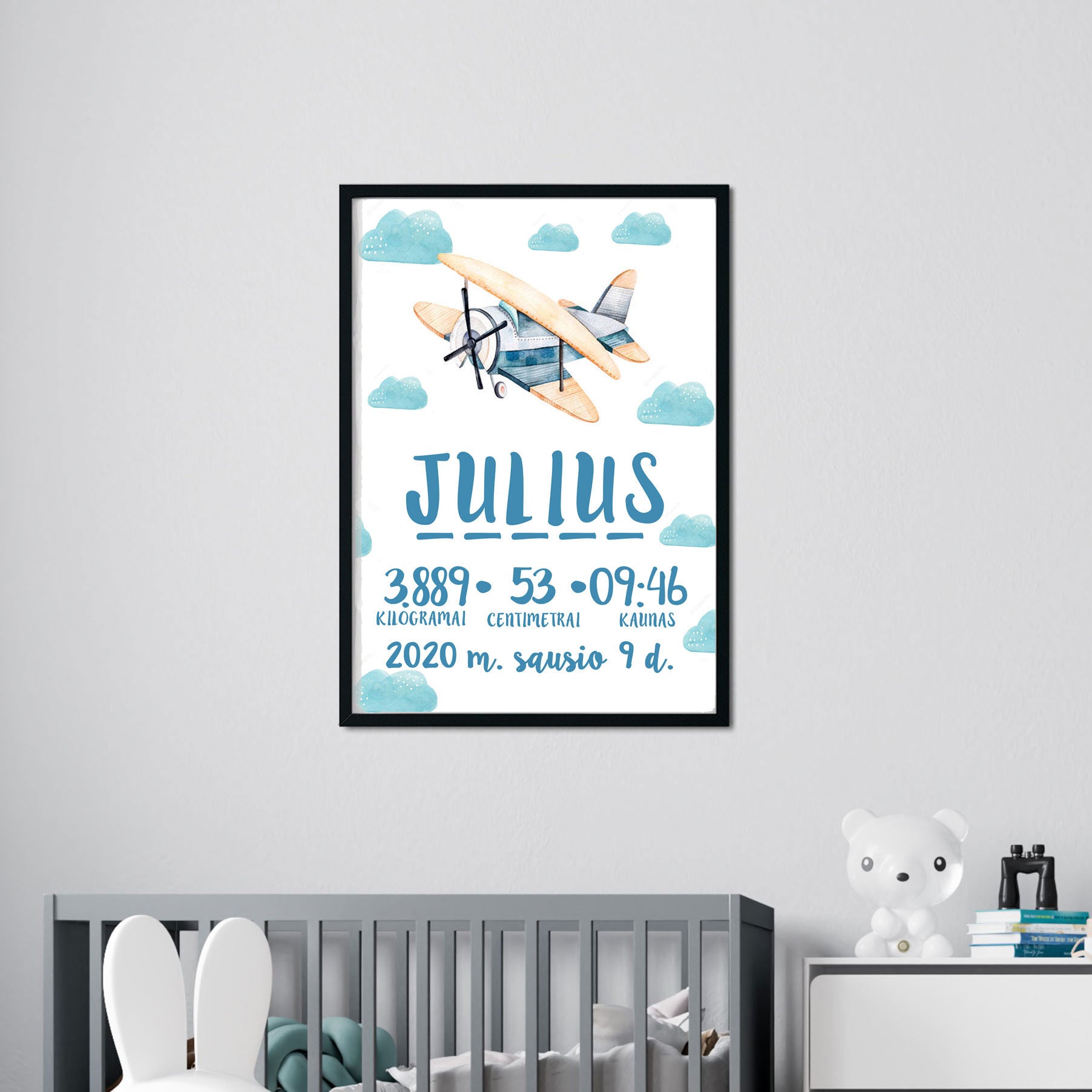 Švelnus ir žaismingas, šis vaiko metrikas – tai puikus būdas išsaugoti brangius akimirkų augimo ir vystymosi momentus. Šis unikalus dizainas, įamžinantis jūsų vaiko gimimo datos, svorį, ūgį ir vardą, praturtins jūsų šeimos kambarį ir taps neatskiriama interjero dalimi. Ši A4 formato metriką puošia pasirinktas dizainas, kuris suteikia jai ypatingą žavesį ir išskirtinumą. Jis pristatoma įdėtas į elegantišką rėmelį, kuris puikiai tinka įvairiems interjero stiliams.